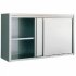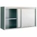RVS muurkast met schuifdeuren en versterkt tussenblad uitneembaar en verstelbaar in hoogte. Schuifdeuren met ingewerkte handgrepen en een geborstelde afwerking.